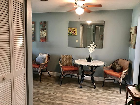 Must see! Located in a 55+ Community on the golf course. Come check out this first floor remodeled end unit with laminate flooring throughout. This is fully furnished and move in ready. Kitchen has dishwasher, flat top range, with microwave built in, refrigerator with automatic ice maker, and garbage disposal. The bathroom has a walk in shower with seats and grab bar, and the vanity is extra long with lots of storage. Bedroom has large walk in closet with added shelves and bars for more storage.Automatic storm shutters work from electric wall switch located in the bedroom. Large living/dining room; sliding glass doors lead to screened porch with stackable washer/dryer. Walking distance to shopping, restaurants, parks, and bus stop; short drive to the beach.