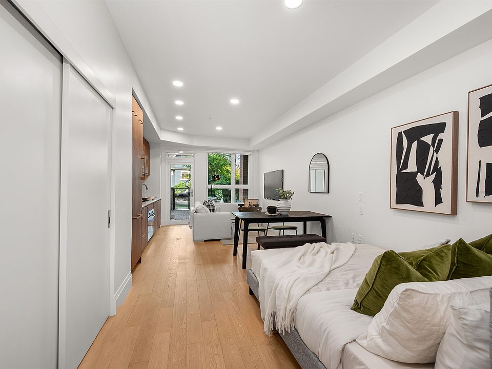MASSIVE PRICE ADJUSTMENT. PRICED TO SELL. This lovely studio suite at 2550 Garden Drive features 425 sqft of open and light filled space. Incredible construction quality from trusted Developer Bucci Developments. Spacious and thoughtfully designed kitchen with premium integrated Fulgor & Milano appliances, wood cabinets and quartz counter. Further features include A/C, HRV system, 9' ceilings, engineered white oak floors, ample storage solutions, built-in laundry station, custom front entry storage niche, roller-shades, USB outlets and more! Just steps to Nanaimo St and Commercial Dr., Trout Lake Park and Commercial-Broadway Skytrain.Amenities include a social lounge, expansive outdoor terrace, garden plots and children's play area. One storage locker incl. Additional parking available.