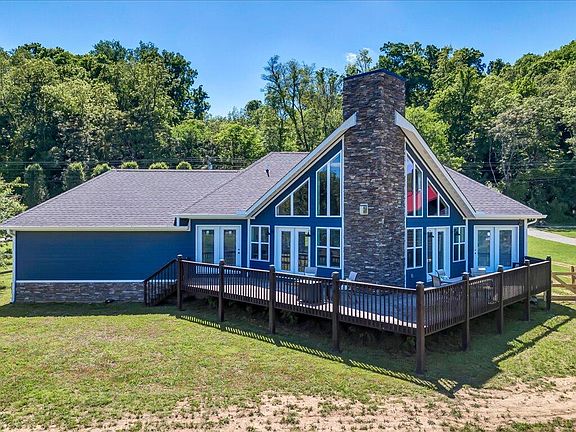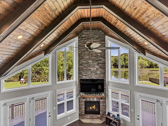 Step inside to an open-concept main level, where natural light floods through custom blinds, highlighting the beamed, vaulted ceilings and a cozy stacked stone gas log fireplace in the living room. The kitchen is a chef's delight with custom two-tone cabinets, a charming farmhouse sink, sleek marble countertops, and a breakfast bar—perfect for morning coffee or casual meals. A large walk-in pantry provides ample storage and easy access to a floored attic space for even more storage solutions. The primary bedroom is a true sanctuary, featuring a walk-in closet and a luxurious en-suite with a tiled walk-in shower. Outside, the extensive wrap-around deck offers breathtaking views of the Holston River's 104 feet of rip-rapped shoreline, ideal for relaxing or entertaining guests. Enjoy the added convenience of an RV hookup and high-speed internet through Trilight, ensuring you stay connected in this tranquil setting.