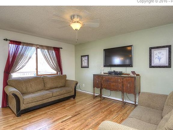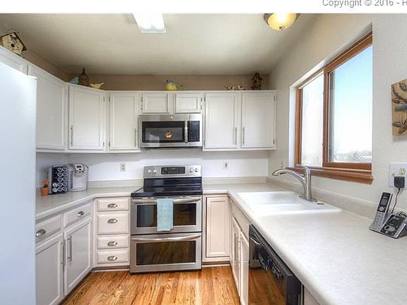 Step into this beautiful 3 bedroom 2 bath home. This home features an open layout upstairs where kitchen and living areas blend seamlessly with brand new hardwood floors. The kitchen has stainless steel double oven with overhead microwave, side by side refrigerator freezer, and brand new Whirlpool dishwasher. Upstairs bedrooms boast a comfortable feel and breathtaking Pikes Peak views. Down the stairs into the lower level features a great family room with gas fireplace, additional bedroom and bath, and laundry room. This home has tons of new features such as roof, oven, dishwasher, deck (less than a year), carpets, woodfloors. You must see this home. The large deck is great to enjoy the evenings, with stairs down to the large backyard perfect for gardens, kids playing, or a hammock to enjoy our comfortable summers.
