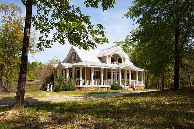 Beautiful secluded Lakefront home on 54+ acres, bordering large amount of corp property. Enter down a beautiful driveway through pecan trees & big hardwood ridges & hardwood bottoms. Property has a beautiful pond, a 26X30 Barn w/power & water. A serene path leads to the lake, platform dock in a secluded cove that leads out to Big Water. The 4 bed/4 bath 2,400+ sq ft Craftsmans style home has over 1,000 sq ft. of wrap around porch/outdoor entertaining area, with a metal shake roof. Enter the home to heart pine floors throughout, V-grove Heartpine on walls & a large Stone fireplace. A 8x14 sitting area off the Great Room overlooks the yard & pond. Owner suite is on the main level. Upstairs you will find 3 guest rooms all with separate full bathrooms. Upstairs balconies on both the front and back of the home, with the back one overlooking the pond. This is a timeless one of a kind home, that is a must see. Rarely do you find this caliber of home on this beautiful of a tract