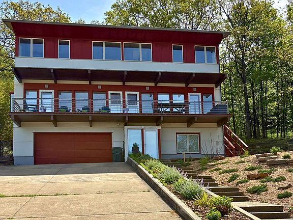 This architect-designed Marlon Blackwell residence offers unmatched style, light, & location—all with STUNNING PANORAMIC VIEWS. Tucked in the heart of town near Gulley Park, Wilson Park, trails, schools, the hospital & restaurants, this thoughtfully crafted home balances bold design with comfort. The upper-level living space showcases floor-to-ceiling west-facing windows & doors stretching 40 ft to capture the view. The kitchen features maple cabinetry, stainless appliances & cozy breakfast nook, while limestone tile & white oak floors bring warmth throughout. Primary suite includes en suite bath. Entertain in Dining/Living Rm or unwind on the cantilevered 45-ft redwood deck. Professionally landscaped with stone retaining walls & tranquil water feature. Includes the adjoining lot for a total of .72 acres. Updates include custom auto shades, custom-designed mailbox, & exterior lights. A breathtaking fusion of architectural brilliance & natural surroundings, this custom-designed '2Square House' is a true work of art.