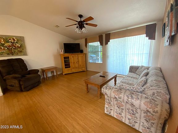 Enjoy life at the luxurious Las Palmas Grand 55+ World-Class Resort. Move in ready, just bring your toothbrush! Relax on your quiet private patio or join year round events & amenities: heated pool, pickle ball, dog park, game rooms, ceramic studio, tennis courts, & more. Golf Cart Incl. Enjoy your fruit trees and Rose Garden! in your oversized back yard. Fantastic location w/ easy access to US60/202 You'll love the multi functional 2 Bed, 2 Bath with Workshop! Open floor plan w/ vaulted ceilings paired w/ gorgeous 3/4'' real bamboo flooring. Plenty of cabinets in the open airy kitchen. Private Laundry w/ Newer Machines - Appliances convey! The main bedroom has a walk-in closet, and private en suite. 2nd bedroom has MURPHY bed and adjacent full bath. Save on moving. Most furniture conveys