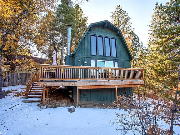 Beautiful GAMBREL Cabin is located in the desirable Nordic-Tract area of Running Springs. Located down the street from the National Forest trails make this an ideal home for those nature lovers. Level driveway and only a few steps to the front deck and door. The deck area wraps around from the front entrance to the living room slider doors making this a wonderful extension of living space. The living room has open vaulted ceilings adorned with knotty pine wood. Enjoy the living room wood burning fireplace on those cold winter nights. The dining area is open to the living room and the kitchen, full bath and bedroom make up this main level. Upstairs has a bedroom with knotty pine ceiling and walls. Loft area for extra sleeping and a 1/2 bath, 2nd level. The house sits on a large lot with the back and side yard which is partially fenced. Just minutes to the ski resort and seconds to hiking trails make this mountain cabin anything you want it to be whether it's full time living or a vacation getaway. Fully Furnished (EXCEPT mirror in living room and outdoor furniture). Seller in last year did many upgrades Flooring, plumbing, exterior painting, Camera/Doorbell.