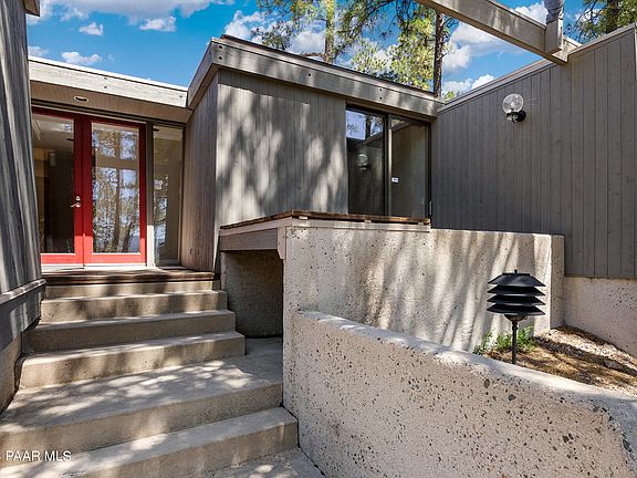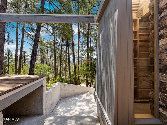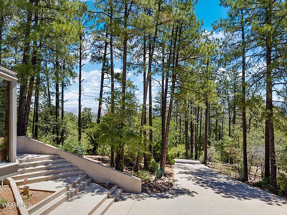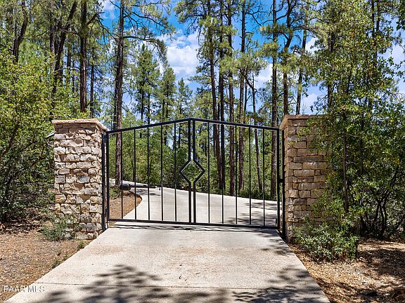 Frank Lloyd Wright meets mountain lodge. This amazing home is in the perfect location. 2.6 acres of usable pine treed land with amazing views from downtown to Mingus Mountain to the Bradshaws. NO HOA. Great privacy with all lots in the area minimum 2 acres. Surrounded by exclusive High Valley Ranch. Access to forest hiking and biking trails from your doorstep but only 4 miles to downtown giving you the best of both worlds. Enter your property with your sweeping gated driveway with a large parking area up top. Home is situated well off the road. Up one level to your main living area. Large vaulted tongue and groove wood ceilings throughout the home. Open living, dining and kitchen area showcased by a large stacked rock fireplace. All living space is on the main level with access to your