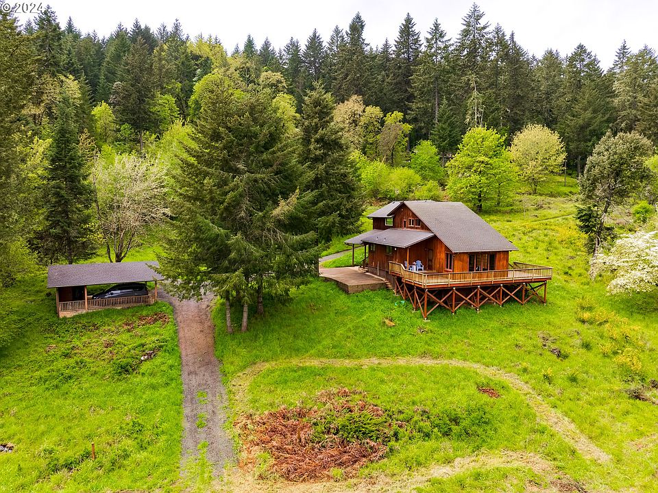 Just over 20 acres of land with NW Contemporary home, 2 car carport w/storage and barn (48x60). Jones Creek runs through the property with a culvert for access between house and barn. Home has vaulted ceilings throughout most of the home. Expansive deck for your relaxation and entertaining was built in 2019. Recent updates to home include: new flooring/sub floor, interior paint, water heater, electrical panel, baseboard heaters, primary bath remodel and kitchen counter tops. Kitchen and dining are an open concept with a pony wall separation and a few steps down into the living room. Primary suite has a loft, large bedroom with double closets and soaking tub, office space or dressing room with a walk in closet and bath. Land is gently sloping and level. Barn has a 9 stalls with interior stall walls but not enclosed on the exterior side. There is the center strip of concrete, power and water as well. Fencing does not follow property lines, house is not in the flood plain.