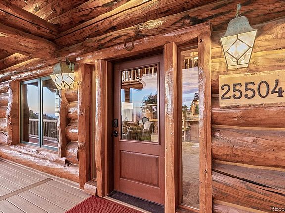 Quintessential Colorado! Be prepared to fall in love everyday while living in this remarkable log home on private acreage with a commanding view of the Denver skyline. This home will captivate your spirit and unleash your imagination with exposed logs and chinking throughout, an incredible prow of windows, tremendous privacy and a kitchen designed for a chef. The burled log columns in the kitchen are an intriguing conversation starter while the important features are all provided at the highest level. Leathered, granite slab, Kitchenaid cooktop, beautiful waterfall glass mullion cabinetry and seating for everyone this home is the home people think of when they think of Evergreen, CO. Warm tones, high vaults, expansive windows and authentic Colorado hand hewed finishes create a destination home for those who love the mountains in a luxurious comfortable environment. The primary suite on the main floor is just right and boasts a barn door entry to a beautiful ensuite bath complete with a large soaking tub with views into the forest, custom travertine w/pebble floor shower and a walk in closet big enough to host its own laundry. Huge wraparound decks create multiple living spaces bringing the outdoors into everyday living and there may be no better experience than relaxing in the hot tub overlooking the Denver city lights. At the end of an easy, quiet straight road the home has the serenity and privacy most only dream of. Sit by the fire, relish in the warmth, and create memories as you plan for the future. This welcoming environment rewards a life well-lived, where you can take a deep breath, sip a cup of coffee on the deck, and entertain your friends and family who have chosen your Colorado home as their new destination of choice.
