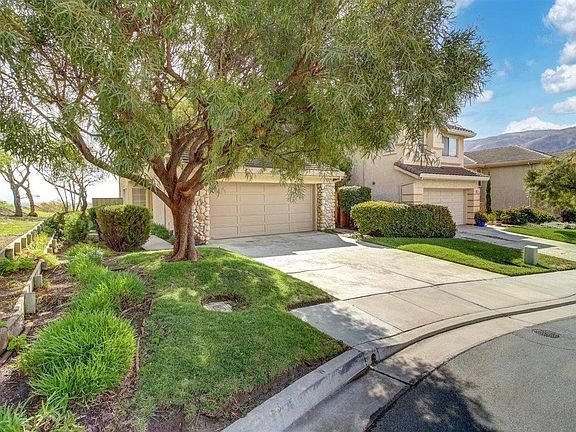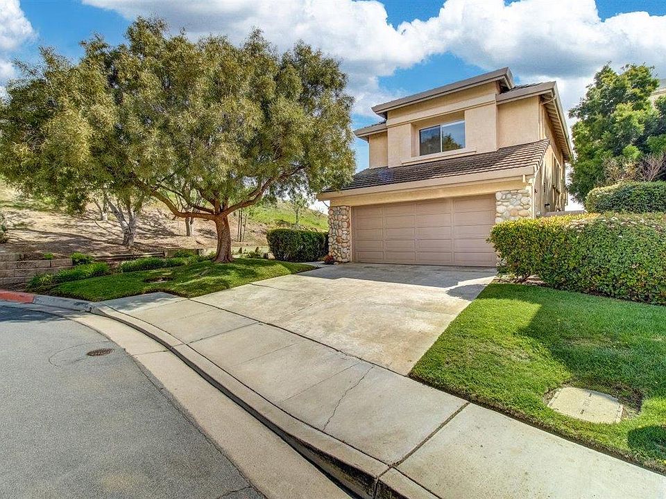 This clean and bright 3 bedroom, 2.5 bath home of 1570 square feet has been excellently maintained and recently polished to move-in condition. High up on the hill, and at the end of a court with only open space beyond, this lively home enjoys privacy and unobstructed views of the rolling green hills. Upon entering, you will at once notice the high ceilings and open atmosphere of the home. This theme continues into the updated, open concept kitchen and dining with granite countertops, stainless appliances, and see-through fireplace. Lots of windows and a sliding glass door take in the beautiful view and welcome you out to the spacious and easy-maintenance back patio. Upstairs are the two guest bedrooms with a shared full bathroom. The primary suite has a private balcony overlooking the hills and a spacious bathroom with walk-in closet, double sinks, soaking tub and separate shower. In the gated Las Palmas II neighborhood with beautiful yet sustainable landscaping and a community pool.