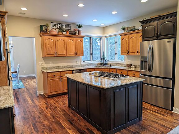 Beautiful, stately executive home located on a wooded lot in Woodland Acres next door to Oneota Golf course and the bike trail. This home features an abundance of natural light! The grand entrance flows from the entry to the formal living room which features a fireplace and tray ceiling. The living room continues to the formal dining room which is just off the updated kitchen. In the kitchen you will find a working island where family can gather and plenty of space for more than one cook. Gather by the second fireplace in the great room. Grill on the deck or sit in the shade of the retractable awning. The main floor is completed with an office with an abstract wall, a half bath and a laundry room. Upstairs the master suite boasts a two sided fireplace, a separate shower, tub, double sink vanity, a toilet room and an oversized walk in closet. Two more bedrooms and a full bath complete the second floor. The walk out lower level has a family room and plenty of space for additional bedrooms and a bathroom is already plumbed in. There is also a storage room. This home sits among the majestic pines and the yard is irrigated. Hurry and call for your appointment to see this one of a kind home!