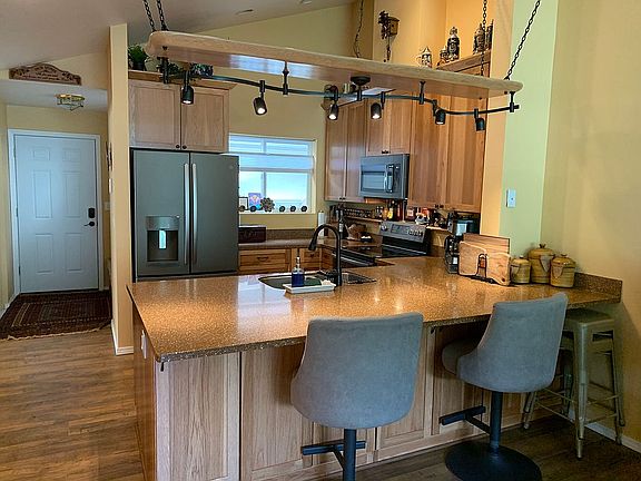 This home welcomes you with vaulted ceilings and a large picture window displaying fantastic views of Mt. Roberts, Mt. Juneau and the Gastineau Channel. Fully remodeled in 2020, it includes custom upgrades, stainless steel appliances, solid surface countertops, tall hickory cabinets, heated floors, and more storage than you’ll know what to do with. Bonus room can be used as a formal dining, den, or office. The large kitchen countertop and double oven is perfect for preparing holiday meals and baking and the built hutch has glass doors, track lightning, and built in wine rack. The laundry room has storage galore with a space saving stand up washer/dryer. Bathrooms have new hickory cabinets, countertops, sinks, fixtures, and flooring. The deck is a lovely fully covered outdoor space that allows patio furniture to be out year-round without the damage of rain or snow. The garage has tons of shelving and still allows room for parking. This is the perfect place to enjoy 4th of July festivities, view the boats as they head down the channel and enjoy the pink sunsets as they shine off Mt. Roberts.