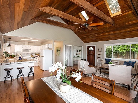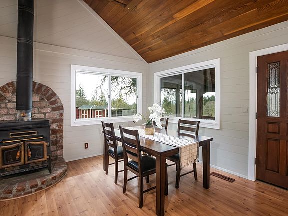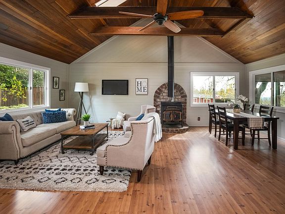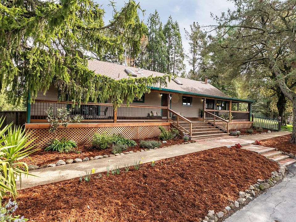 Charming rural property set on almost 3 sunny, usable acres. The circular driveway welcomes you to this single story home with expansive covered deck. Relax on the porch swing and built in seating, enjoy the serene views, sunsets and peek of the ocean. The main home features a spacious great room with vaulted redwood ceilings, open kitchen, spacious living and dining areas with wood burning stove. Exterior door to the private fenced back yard with hot tub. Master bedroom with vaulted ceiling and loft, ensuite bathroom, sliders to front porch. Two further bedrooms & hall bath. Laundry/mud room with exterior access. Detached 2 car garage with comfortable 2 bedroom/1 bathroom guest house above, approx 672 sq ft living space plus private fenced back yard. The property can accommodate up to 5 horses, hay storage, tack/feed room, several run-in shelters with corrals and a large grassy fenced pasture, round pen, pig sty. Served by an excellent private well & Comcast Internet!