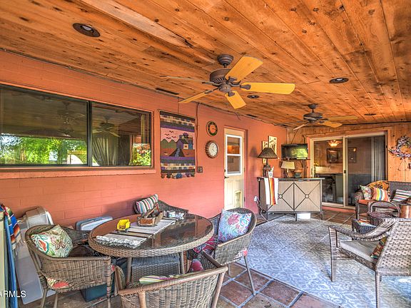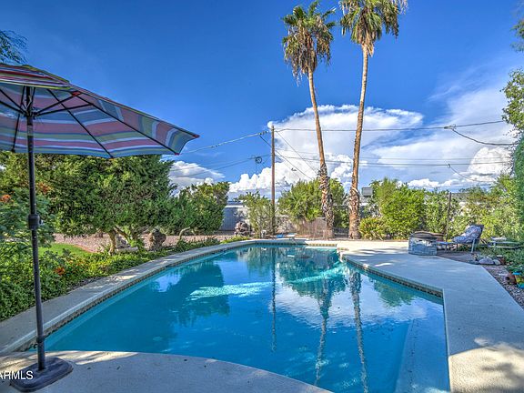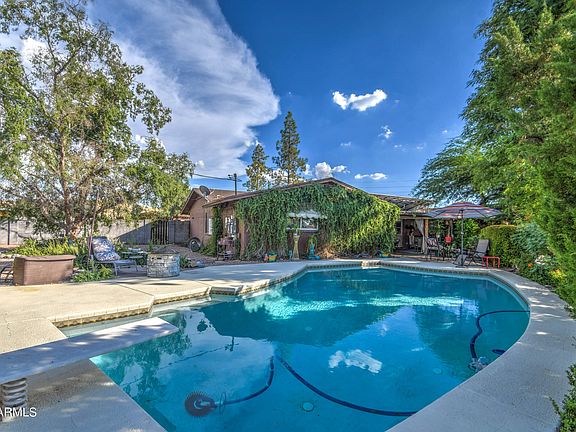 This is a SW Territorial style home with Frank Lloyd Wright influences on a cul-de-sac. NO HOA! Extraordinarily large lot featuring a diving pool. Updated roof in 2018 with $30,000 of solar panels offering energy efficiency, with tons of land for backyard fun with endless possibilities like pickle ball, basketball or tennis courts. Beautifully designed cedar wood covered patio offers cool seating area with views of pristine yard, gardens and pool.