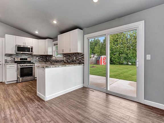 Beautiful white cabinetsLarge bay windowVaulted ceilingsStone backsplashBeautiful landscapingGreat storage spaceSs appliances