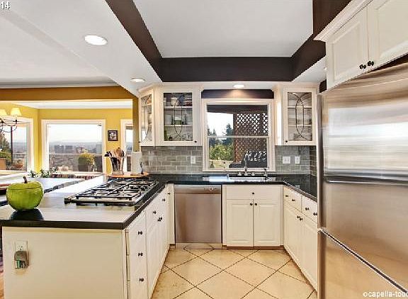 Expanded English with incredible views of the city & Mt Hood. Large main level with grand spaces taking advantage of the view. Large open living and dining rooms, custom kitchen w/ ample storage, granite slab, stainless app. French doors out to entertaining deck with unbeatable views. Main floor office. Upper level with 3 large bedrooms and 2 full bathrooms. Lower level family room, guest suite, full bath, deck & 1400 bottle wine cellar