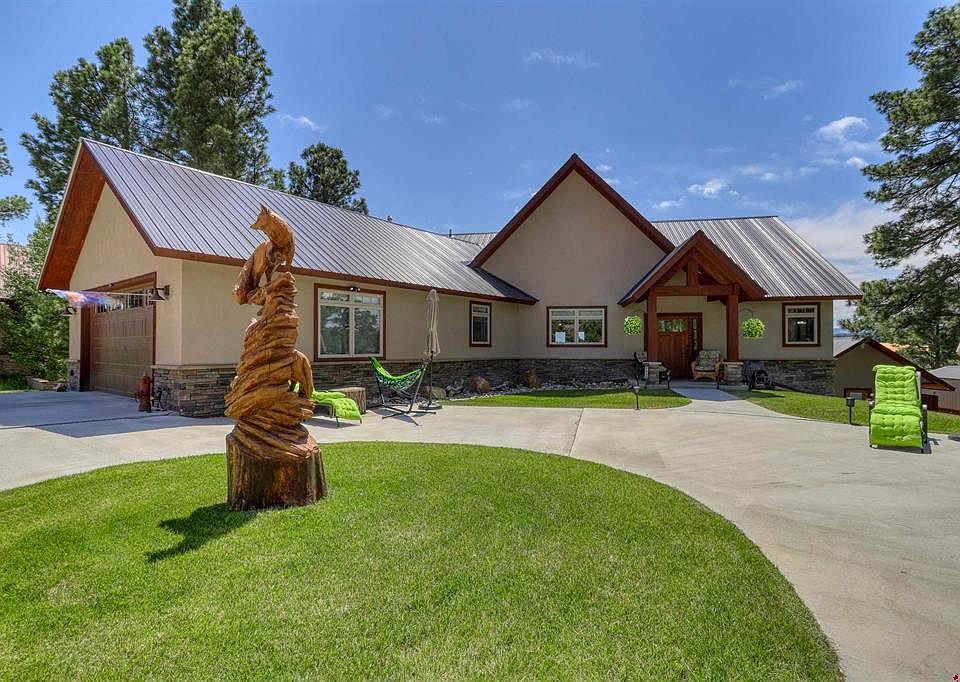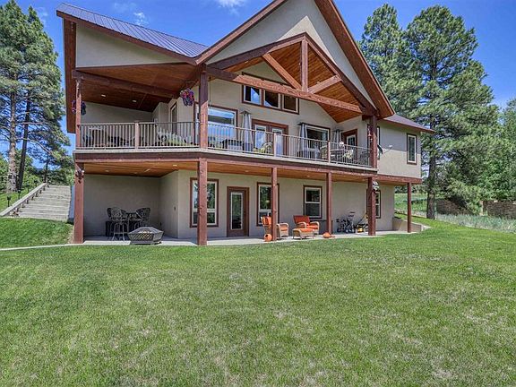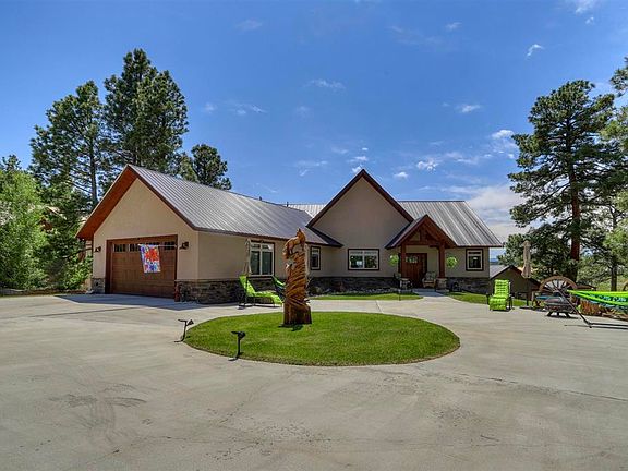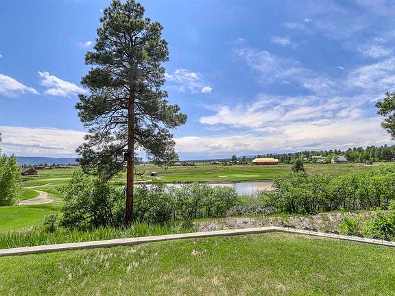 Luxurious, comfortable living; this home has it all! Close to Lake Pagosa, recreation center, restaurants, grocery store and walking/biking trails! Circular drive , with room for RV etc., including a one of a kind tree sculpture done by a nationally known artist, Chad Haspel, is located on paved road, with oversized double car garage, heated roof, and drain for those snowy, wet days. Large covered deck on main level, overlooks, golf course, pond, Lake Pagosa with mountain views! It is perfect for morning or evening relaxation. There are blinds for the afternoon sun, and full patio on lower level as well, with area for a hot tub. Dog run with doggy door/house, chain link fencing and wood for those evening fires. Stepping inside, home offers spacious living and dining area with stacked rock gas fireplace; great for entertaining with large kitchen island, with porous granite throughout and lots of built in shelving! Lots of countertop spaces, custom cabinetry, under counter lighting, double oven, gas stove, walk in pantry, 1/2 bath, utility area, in floor heat and more. Shades and drapes throughout home. Master on main level, with large soaking tub/shower., travertine and walk in closet. 4 TV's throughout home will stay. Some furniture items may be negotiated. Lower level features two bedrooms, den, linen closet, looking out onto golf course. and lush grass lawn. Fully landscaped with storage shed; 10'x12'x8',for all lawn equipment. Builder has left a notebook with all of his resources, for any additional needs you may encounter. Bonus room hideaway next to dog run, has all utilities, 180 sf ft, and great for family!