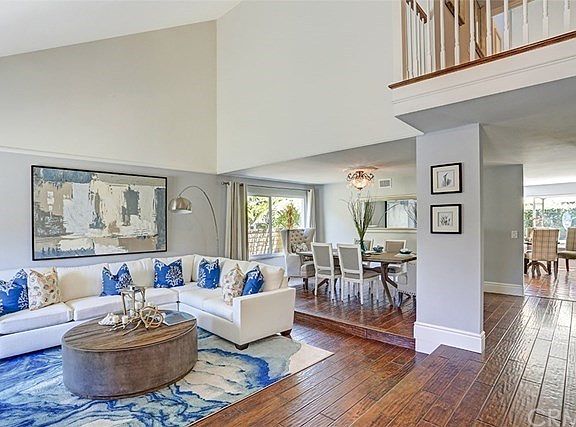 Welcome home to this absolutely stunning 4 bedroom 3 bathroom home centrally located in the heart of Laguna Hills! From the moment you arrive, you are greeted by the beautiful curb appeal featuring custom hardscape and landscape. Upon entering the home you are captivated by the soaring vaulted ceilings and the bright natural light created by the numerous upgraded dual pane windows throughout the home. The living room and dining room feature wood flooring, custom wainscoting, and a designer chandelier. The highly upgraded kitchen boasts granite counter tops, stainless steel appliances, and wall to wall windows. The kitchen leads you into the family room featuring even more windows, a brick fireplace, and wet bar. The large master bedroom is the crown jewel of this home offering vaulted ceilings, a master retreat with fireplace, and trex deck balcony over looking the large backyard. The master bathroom boasts dual vanities, walk in shower, and a large soaking tub with wall to wall windows. The upstairs offers 3 additional bedrooms and an upgraded bathroom featuring designer finishes, dual vanities and a shower/tub combo. As you enter the large backyard, you are greeted by privacy, peace and quiet! It is the perfect canvas to create the backyard of your dreams. This home is also walking distance to El Conejo park, and top tier schools. This neighborhood also offers the benefits of No mello roos, No HOA and a low Tax Rate!