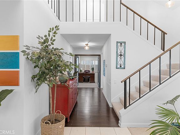 Exceptional 4-bedroom/3 bath home(with one bed & bath downstairs), located in the highly sought-after neighborhood of Serrano Ridge. Immaculate home has a formal living room and dining room. The family room has beautiful walnut hardwood flooring, fireplace, and built-in shelving and cabinets. Lots of windows with plantation shutters throughout. Kitchen has newer stainless-steel appliances including double ovens, gas range top, quartz countertops and kitchen nook open to the family room. A bedroom with double glass door entry, a full bathroom, and laundry area are all located on main floor. Upstairs you will find a very spacious master suite with a fireplace, walk-in closet and master bathroom with double sink vanity and a walk-in shower. There are also two secondary, nice size bedrooms. This home has drought resistant landscaping in front, and the back is fully paved with a patio cover. Located near shops, dining and walking distance to schools. Enjoy membership to the resort-like Sun and Sail Club with 4 pools, basketball court, volleyball, playground, tennis & pickle ball courts, gym with view of the lake, banquet room, locker room and more! Easy access to the 5/405 and toll roads, just a wonderful community.