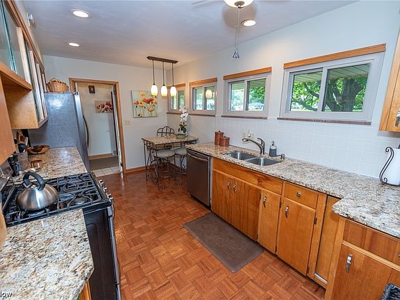 If you wanted a turn-key home, this beautiful ranch home is it… As you enter this home, the spacious kitchen with beautiful cabinetry, granite countertops, stainless steel appliances, and a coffee area are are to your left at the front of the home. From the kitchen, you can walk into the Living and Dining Rooms that have a wall of large picture windows allowing an abundance of light to flow through that overlook the beautiful private backyard. Just off the living room is a fabulous sunroom that opens to a oversized patio. There are three bedrooms and an updated full bath. One of the bedrooms has a closet that has been converted in a main floor laundry room. (It can easily be converted back) Down the stairs just off the kitchen is a beautifully updated hallway with windows leading to the lower level. The family room offers a fireplace and is carpeted, the back room could be used for an exercise area or an office and has tons of storage. Finishing off the lower level is a new showe