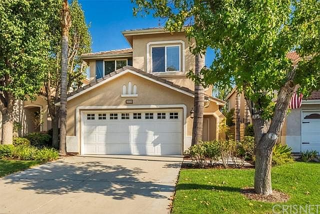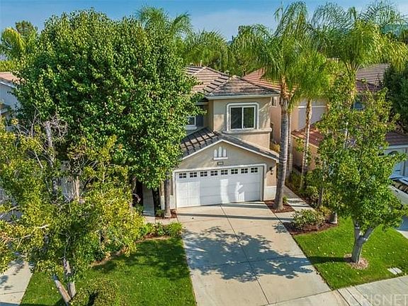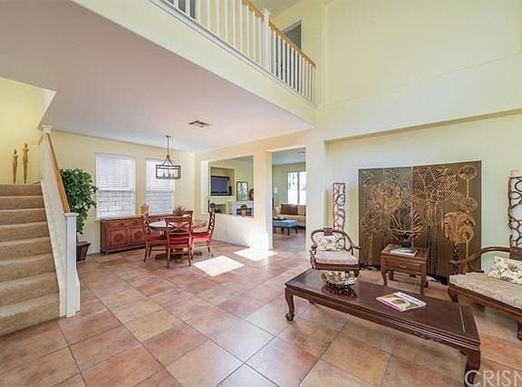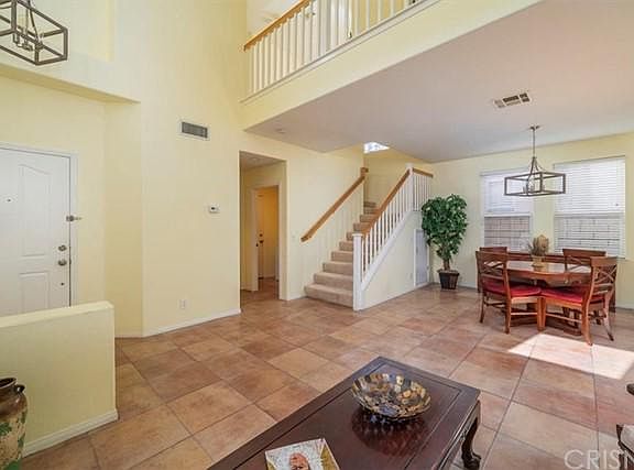 Exclusive Stevenson Ranch home! Imagine calling this 4 bedroom, 2 1/5-bathroom house your new home! Walk in to find upgraded tile flooring, an open floor plan and high ceilings. The living room and dining room are spacious and flow easily into the family room with fireplace. Large windows let in lots of natural light, the open kitchen features an island, recessed lighting and plenty of cabinet space. There are sliding doors providing great views of the backyard and easy access. Outside you'll find a large covered patio, huge backyard and views of the mountains. There is direct access to the 2 car garage as well as a laundry room with washer and dryer included. Upstairs the primary bedroom has an ensuite bathroom with double sinks, shower, soaking tub, and walk-in closet. There are 3 more bedrooms, all with ceiling fans along with another full bath with double sinks and a shower/tub combo. This home is conveniently located near shopping, restaurants, the 5 freeway, and Dr. Richard Rioux Memorial Park featuring tennis courts, playgrounds, picnic areas, sports fields and so much more.