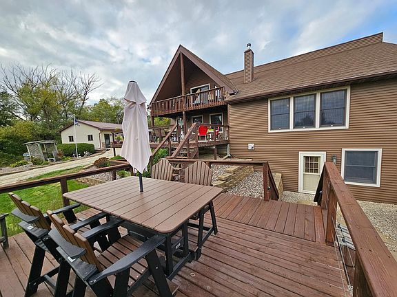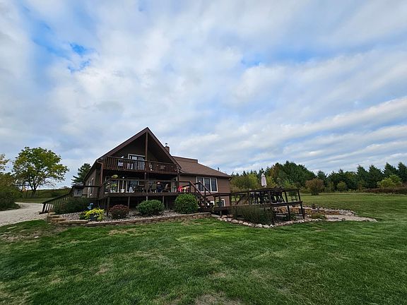 This secluded hobby farm sits nestled on a rolling south facing bluff with panoramic views. The 3506 square foot 4 Bedroom & 3 Bath home has multiple decks & patios to enjoy the spectacular views. The 76 x 26 outbuilding has great curb appeal and concrete floor with adjacent concrete basketball court. The 24x 36 outbuilding has concrete, is heated, & insulated with water from an artesian well (in addition to the main well) & a great woodworking shop. LP furnace with outdoor wood burning option. 10x16 garden shed. 22.55 tillable acres with 13.44 acres enrolled in CRP with a $2379 annual payment. CRP enhances wildlife habitat through native grasses, wildflowers, and multiple food plots. Multiple springs & 2 creeks on the property flow year-round. An established trail system runs throughout the property. Tree stands and a great permanent elevated hunting blind are in place. The property and neighborhood have very good whitetail genetics, good turkey population and pheasants.