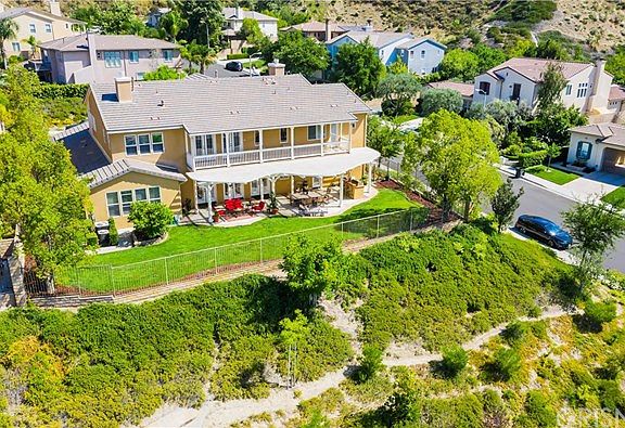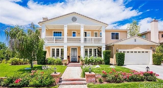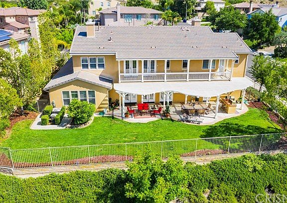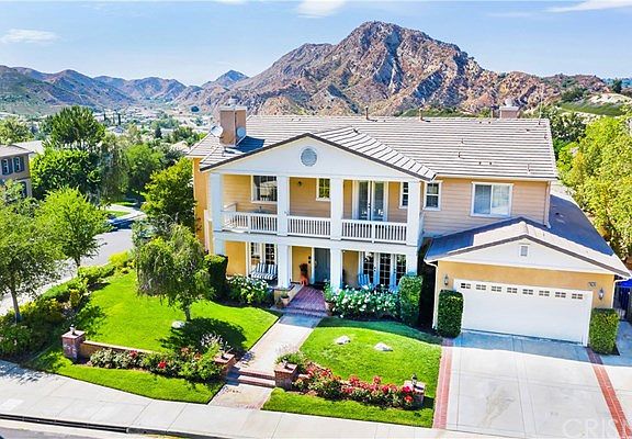 Rare Southern Oaks 6-bedroom with terrific pool-sized view lot! Sitting at the top of the "Manor" section & located on a flat cul-de-sac, this home offers 2 private bedrooms down with attached baths - perfect for parents, guests or older children. In addition, there is an office with separate entrance on the first level & another half bath. So, 2 bedrooms with attached baths down + office with 4 more bedrooms & 3 bathrooms up - all in one of the most desirable neighborhoods in Santa Clarita! This is the signature Plan 3 with balconies front & back to really enjoy the elevated location. Spacious kitchen in granite with 3 sets of double french doors that lead to yard. Wood & tile floors. Baths all in neutral tile & master has fireplace + retreat. With some of this model offering the 4-car tandem garage, this property has the bed & bath, a third-car tandem area & 2-car garage instead. Walk to the community pool & clubhouse & enjoy a gorgeous neighborhood with large lot & no Mello Roos.