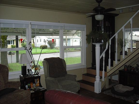 Renovated 1920 craftsman beauty: deck off master BR w/french doors; beautiful original wood floors; roomy kitchen with lots of cupboards, pantry, and work surfaces; cheerful utility/laundry room with access out to deck and backyard;roomy living room with staircase leading up to 3rd bedroom with a gorgeous view of the Coburg Hills; french doors to 2nd B.R.; small office; newer hot water heater; newer vinyl windows throughout w/ custom "plantation blinds"; vinyl siding; attached one car garage; attached shop with walkout to large fenced backyard with deck, greenhouse, shed, clothes line, dedicated garden areas, pear tree, grapes lots of heirloom plants; new roof 2013; new one car garage 2014