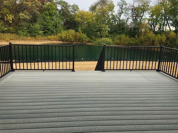 Natural pondPartially covered deckBreakfast nookQuartz countersWhite kitchen cabinetryTile backsplash