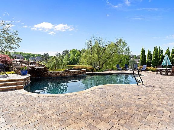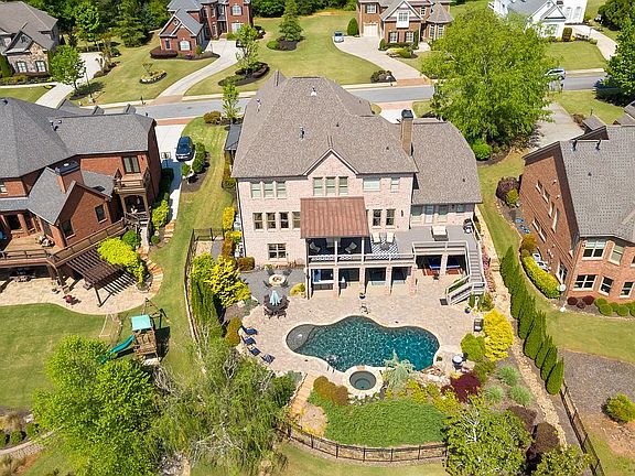 A ONE IN A MILLION VIEW FROM YOUR COVERED DECK OR POOL! This like new custom built brick and stone estate with circle drive and 4 car garage will take your breath away. Plan to spend endless nights lounging or entertaining family and friends in this gorgeous home that has it all. Light and bright kitchen with white soft close cabinets and custom glass fronts, hidden walk in pantry, KitchenAid appliances. Home office on main with judges paneling, separate banquet sized dining room, mud room entry from garage, hardwoods throughout main and upstairs, 4 inch plantation shutters, spacious owners suite with fireside sitting room and views of the lake, spa bath with double shower and freestanding tub, generously sized secondary bedrooms, with ensuite baths and walk in closets, finished terrace level with media room, rec room, wet bar, fitness room, large bedroom and full bath. Walk out from terrace level to large patio surrounding heated pebbletec pool and hot tub, a lower patio sits at the lake level, a great place to fish or feed the ducks! Level lot on quiet cul de sac. Great South Forsyth schools and close to everything, but tucked away in a gated lake community. Absolute perfection. You'll never want to leave, and neither will your friends! Welcome home...