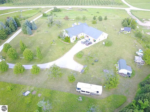 Lovely 5 acre rural country setting north of Suttons Bay for this custom designed one level home. Beautiful countryside and water views. This home offers a 24.6 x 9.6 (3-season) sun room; spacious main floor master suite with private bathroom with jacuzzi tub and his/her vanities and closets; 3 car attached garage with deluxe heated 13.5 x 36 shop (hot and cold water) with 15 x 36 overhead bonus room; spacious kitchen with hickory cabinetry and Wilson Art counters; 12 x 12 potting shed; 12 x 20 shed with lean-to addition and ug electric; wired for generator; 8 zone sprinkler irrigation system; 1000 gallon propane tank; partially finished, poured concrete basement with daylight windows and plumbed for 3rd bathroom. Gardener's delight with two raised garden beds, producing cherry trees, roses, blackberry bushes, perennials and irrigated garden area (8 zones)