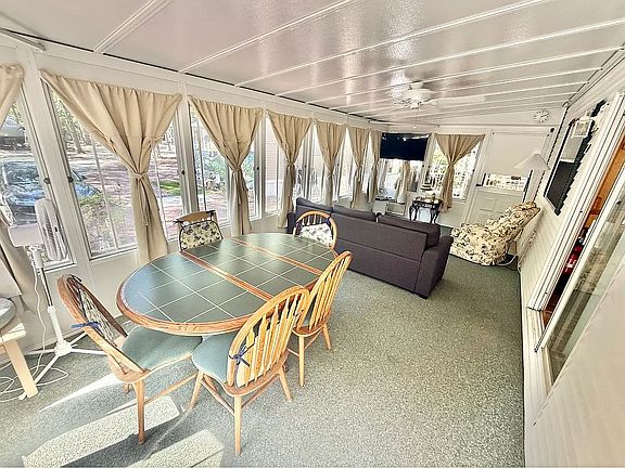 Site G62 features a 2005 Park Model with attached Florida Room and covered rear porch. The unit has two full bathrooms, one queen bedroom, one bunk room with two bunks, plus two sleeper sofas. 3 large tv’s are included. Kitchen has a full size refrigerator, microwave, toaster oven, stovetop oven, and double sink.