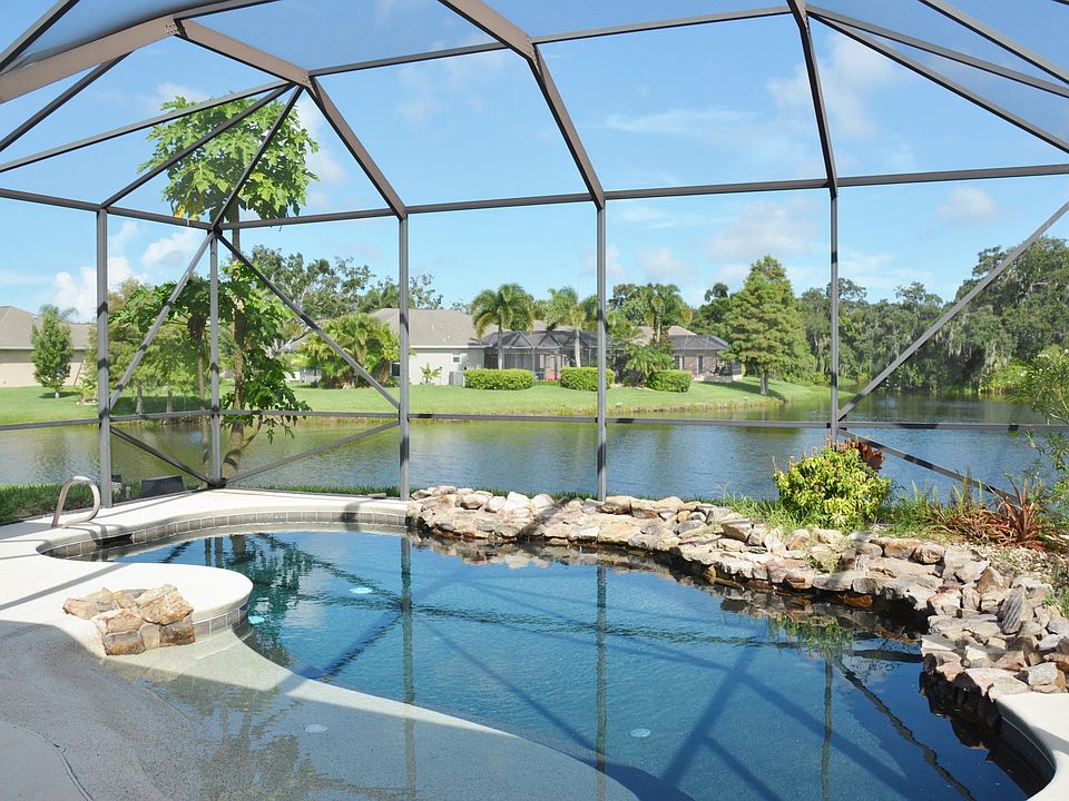 NEW ROOF & A/C to be installed! Premiere lakefront lot located in a gated community and on a cul-de-sac! This 4 bedroom PLUS OFFICE, 3 bath, 3-car garage POOL home on oversized, pie-shaped lot with fabulous water views and an array of birds! No carpet throughout -- tile in main living rooms and Brazilian cherry hardwood floors in all bedrooms and office. Great floor plan with oversized living spaces and high 14' ceilings. Indoor laundry room and washer/ dryer stay. A 4' fence is allowable with HOA approval. Also, kayaks are allowed on lake!