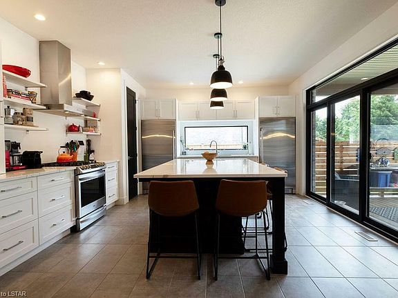 THIS STUNNING HOME offers a spacious open concept design, perfect for modern living. The main level features a gourmet kitchen that will surely impress any chef. With a 7.5' x 4.5' island, beautiful quartz countertops, and a breakfast bar, it's a dream come true. The kitchen also boasts plenty of cupboard and counter space, a separate stainless steel fridge and freezer, and a convenient pantry. You'll love the patio walkout to the covered rear deck, perfect for outdoor dining and entertaining. The dining area off the kitchen is spacious enough to accommodate a large family table and flows seamlessly into the bright and airy living room. The living room is the ideal space to relax and unwind, with its elegant gas fireplace, large windows offering ample natural light and a great view. The main level also offers a convenient 2-piece powder room and a good-sized mudroom off the oversize garage. Upstairs, you'll find three generously sized bedrooms, including the master suite. The master suite is a true retreat, featuring a huge walk-in closet and a luxurious five-piece ensuite. The ensuite boasts a soaker tub and double sinks, adding a touch of luxury to your daily routine. Additionally, there is a full 4-piece bathroom on the second level and laundry facilities conveniently located on this level, making laundry days a breeze. The backyard of this home is truly a haven. With a covered rear porch, a massive deck surrounding the above-ground pool, raised garden beds & a fully fenced yard, it offers the perfect setting for outdoor enjoyment and privacy. Plus, the backyard is partially wooded in behind, adding a natural and serene backdrop to your outdoor space. Additional features of this home include a 200 amp service, a large unfinished basement ready for your personal touch, and a fantastic location on a quiet court. You'll enjoy the peace & tranquility of the neighborhood while still being close to all the amenities that Mount Brydges has to offer. Don't miss out!