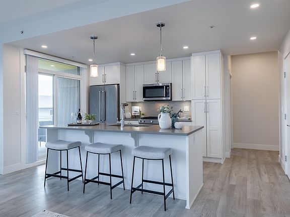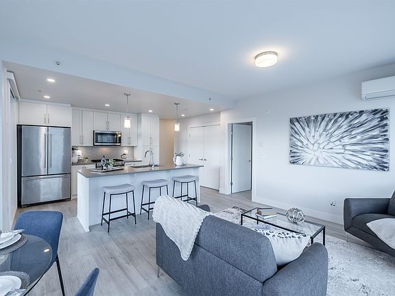 Gorgeous 2 bedroom corner unit at the highly sought after Mill District complex in Central Abbotsford. Primary bedroom with ensuite & walk in closet. Bedrooms are on opposite sides of the unit for added privacy. Open concept living with an entertainers kitchen: quartz counter-tops, gas range and a large island. Unit faces south/east with south facing balcony for maximum light. Close proximity to Seven Oaks Mall, Mill Lake and Abbotsford Regional Hospital. Secured underground parking space, storage locker - Pets allowed with restrictions and rentals allowed. Don't wait on this beautiful condo, it won't last long.