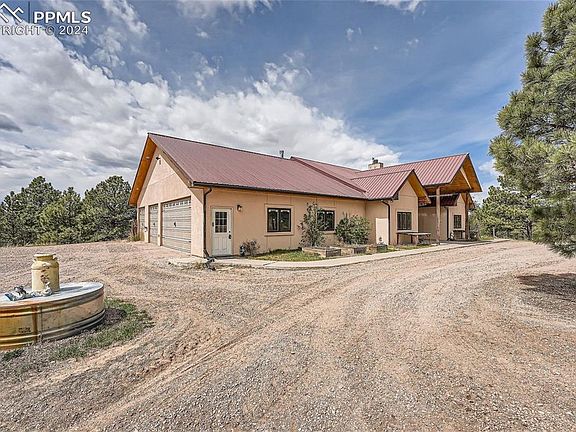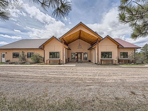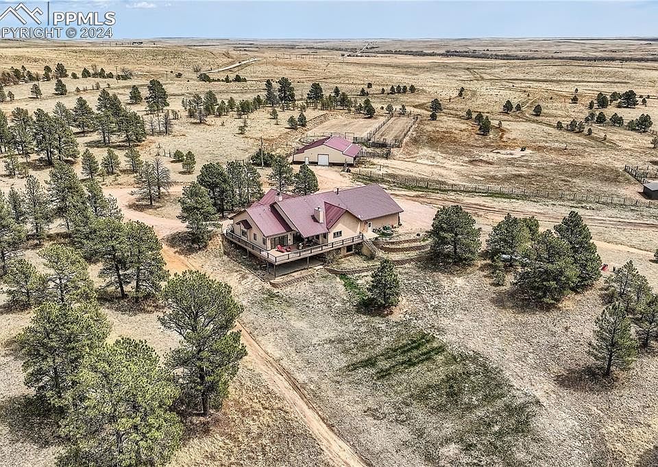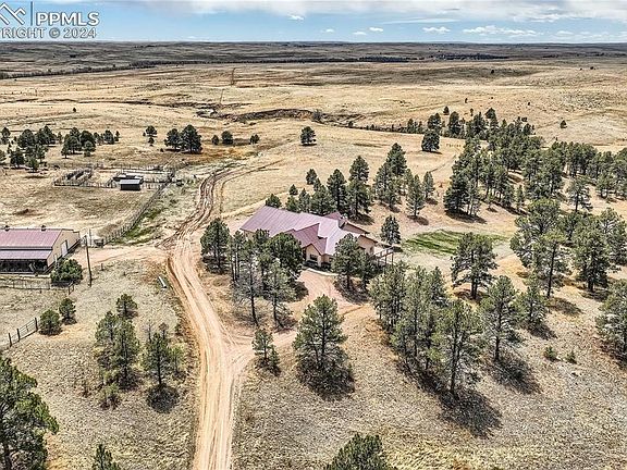 This beautiful Ranch offers 165 acres of rolling hills covered in native grasses, open meadows, natural ponds, wooded areas and expansive views of the Colorado Rockies. The variable terrain includes a deep draw as well as flat range grazing land and the Ponderosa Pines provide excellent cover. The stock dams and water tanks provide water to livestock and wildlife on the property. Ranch Headquarters is a 6 bedroom, 5 bathroom ranch style home set in the Pines with an inviting, open floor plan, high vaulted ceilings and style in every corner. The stone and woodwork provide added elegance to the thoughtful planning and craftsmanship. The main kitchen includes custom hickory cabinetry, a center island and a large walk-in pantry. And the master suite boasts a coffered ceiling, a huge closet and 5 piece bathroom with a clawfoot tub and beautiful rock and tile shower. Enjoy the warmth of the large fireplace in the main living room or wood stove in the basement family room. The walk-out basement makes a great “Guest House” with it’s own kitchen and laundry room. It also includes 4 bedrooms, an open family room and a theater room. The 4 car garage is 35’ deep for extra parking or a workshop. The barn measures 36x48 with 12x48 overhangs on each side and includes two 12x12 horse stalls, and a 12x24Broodmare stall. Plus a large tack room and hay storage area. On the north side of the barn are 4 professional dog runs(10x18). The outdoor calf roping arena and roping chute are also included. Two loafing sheds and additional pens for horses or cattle are just south of the barn. Come enjoy Colorado ranch life and good country living.