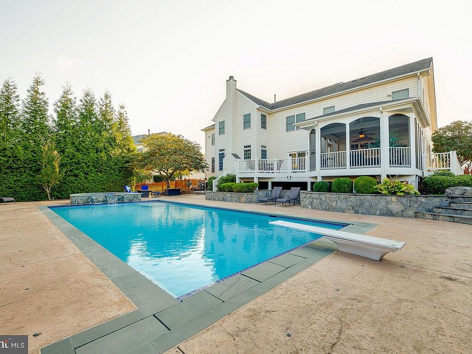 Fabulous, South Riding Estate Home! Outstanding backyard retreat with salt water pool, hot tub, screen porch, patio, lawn space, irrigation system and professional landscaping. A unique opportunity with 5 spacious bedrooms and 4 full bath upstairs. Grand entry with elegant staircases. Elegant dining and living rooms. Great room with stone, wood burning fireplace. Main level office with built in cabinetry. Sun filled kitchen with large center island, granite and stainless steel appliances. Fully finished basement with custom wet bar, full bath with steam shower, large flex room perfect for playroom or gym, pool table and walk up to the backyard retreat. Custom closets and upgraded details throughout. Pool is open! Move in, relax and enjoy!