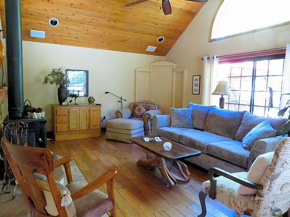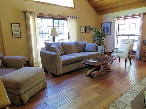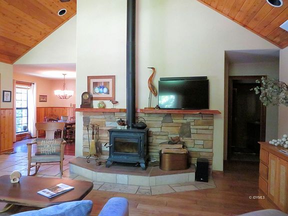 This beautiful chalet was remodeled in 2013. The living room has vaulted ceilings, half circle window, glass sliding door leading out to the wrapped deck. A stacked stone fireplace with pine mantel with efficient hearthstone wood stove. The floor is antico hand scraped hardwood. The dining room has a wall gas fireplace Kitchen appliances are stainless steel. David Lilieholm designed the master suite with a walk-in closet, gas wall fireplace & sliding glass door leading to a hot tub in the deck. The master bath has a glass block shower & dbl. sinks and a elec. wall heater. Upstairs is a large bedroom with sitting area, 3/4 bath & lg. storage. Auto drip irrigation in front & back yards. The oversized two car garage has a shop, three large cabinets, and is connected to the house by covered walk-way.