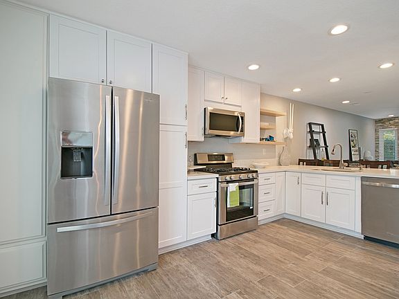 COMPLETELY REMODELED MODERN TOWNHOME! Looks just like a Display home! Brand new white kitchen is a chef's dream with Quartz Countertops and all new Stainless Steel appliances, including Gas Range and French Door Refrigerator. You will love how the plan has been reconfigured to open the kitchen up to the living room and now the Master has it's own private bathroom! There are 2 full baths, plus a half bath downstairs, all completely remodeled. The ceilings have been scrapped, all new flooring, new windows, paint, baseboards, interior doors, handles...everything is new! It comes with a 1 car garage with access off the rear patio and 1 reserved spot. Unit is on backside of community, where is it very quiet and peaceful, away from any street noise and has a view of the pool. Both the POOL and TENNIS COURTS are just steps away! Great location only about 1 mile to I-5 & 73 Toll Road, under 2 miles to the train station and under 7 miles to the BEACH! Turn Key Property with no one above or below!