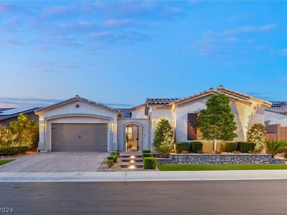 Single story in Inspirada upgraded like a model home! This Toll Brothers home features 2,684 sq ft with 3 bedrooms, den and 3 bathrooms with all the bells and whistles. Beautiful Tiel floors throughout with shutters. Kitchen with custom cabinets and countertops, stainless steel appliances and breakfast nook. Family room with custom built-in entertainment center with speakers throughout, fireplace, custom bar with two beverage refrigerators. Primary bathroom with large walk-in shower, custom closet. Double stacking doors with motorized shades lead to the backyard that is an entertainers dream with built in BBQ, covered entertainment area with firepit and pool/spa. This house is pristine! Located in highly desirable Inspirada with parks, pools and community events. Rare opportunity!