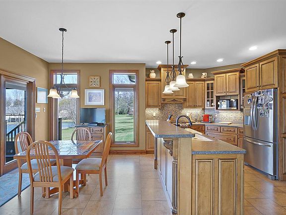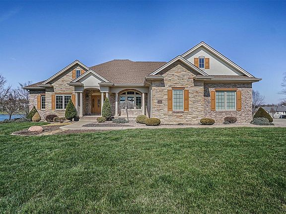 Remarkable Home on stunning lake front lot! Interior welcomes you with bright lake view the moment you walk in. Open design leads to formal dining area & great room with gas fireplace including built-in cabinets & full wall of windows to enjoy view of lake. Luxury kitchen boasts center island, sink with lakeview, breakfast area with access to screened deck, & pantry. Office off entry foyer, Main level laundry by kitchen, & powder room off kitchen. Primary bedroom suite with sitting area, 2 walk-in closets, & large bathroom with double sinks, shower & separate tub. Lower-level features 2 Bedrooms & Large Living area with lakeview, Rec Room, & storage area. Home built with quality features throughout: 2X6 walls, solid wood doors, crown molding, premium windows with blinds, Stone & brick front, sprinkler system, gutter guards, & oversized garage. New roof 2019. This custom ranch was well designed to optimize lake front setting with great views. Rare Property, Don't Hesitate!