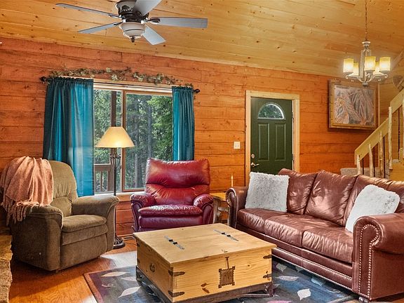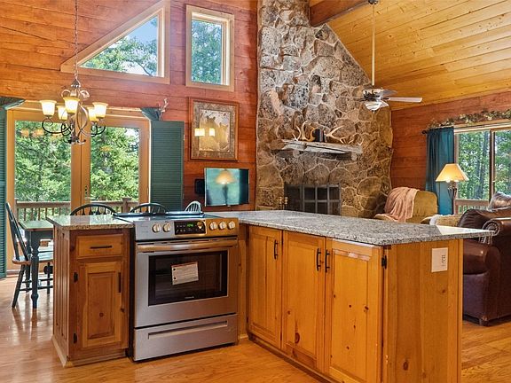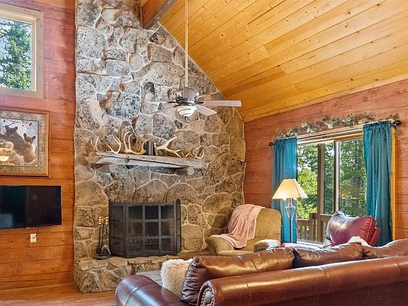 Charming D-log home nestled on 8 acres of wooded land with no HOA.This property features an oversized 2-car garage, a spacious wrap-around deck with built-in benches that provide a picturesque setting amidst the trees. Enjoy the rustic elegance with the moss rock fireplace or heat the cabin with the wood burning stove. An open floor plan with all new carpet and a main level bedroom with ensuite, Aspen tongue and groove, this home offers both comfort and serenity. Kitchen equipped with all new appliances and granite countertops. Explore nature trails right outside your door. Don't miss the opportunity to own this remarkable property.