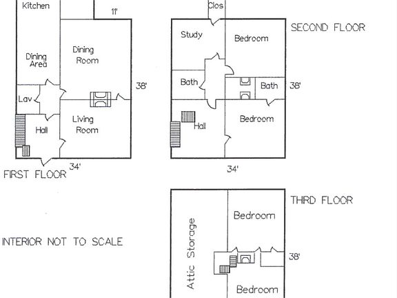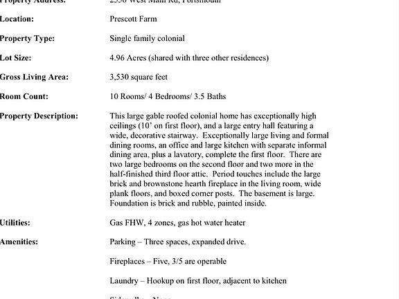 This large gable roofed colonial home has exceptionally high ceilings (10' on first floor), and a large entry hall featuring a wide, decorative stairway. Exceptionally large living and formal dining rooms, an office and large kitchen with separate informal dining area, plus a lavatory, complete the first floor. There are two large bedrooms on the second floor and two more in the half-finished third floor attic. Period touches include the large brick and brownstone hearth fireplace in the living room, wide plank floors, and boxed corner posts. The basement is large. Foundation is brick and rubble, painted inside. Not included in rent: Utilities and $20 monthly fire alarm monitoring. No pets allowed without prior written consent.