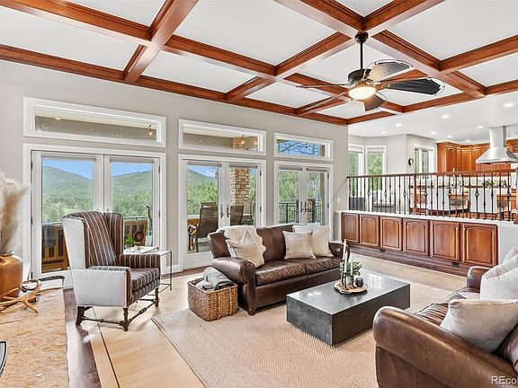 This rare property affords the ultimate in Colorado living – breathtaking views, exceptional living spaces, privacy, and superior style. The drama of the home’s expansive, sunlit interiors and captivating views unfolds just past the front doors, in the conjoined great room/kitchen that occupies the heart of the home. Soft hues sparked by the views of sky, clouds and trees make a soothing impression and artfully play off the natural stone fireplace in the great room, exquisite wood accented ceiling and hardwood flooring throughout the main level. The sleek central kitchen was cleverly planned with numerous windows and workspaces to take in the view and to one side adjoins the breakfast nook and to the other, the butler’s pantry which gives access to the formal dining to create a space that is not only beautiful but highly functional. The main rooms radiate out from the central living area leading to the more private upper and lower levels. Upstairs, a serene Primary suite features a warming fireplace, large picture windows, private deck with impeccable views and a luxuriously comfortable bathroom. Also on the upper level, three additional bedrooms and two full bathrooms while one more level up a bonus room completes this highly functional floor plan. A spacious walk-out lower level is complemented with quality finishes, to include high ceilings, numerous windows, a fifth bedroom and bathroom and large recreation room with back stairs that give direct access to the garage. Meticulously designed to highlight its natural surroundings, the home is expertly situated to command breathtaking views from nearly every room while the indoor spaces flow seamlessly to the incredible outdoor living spaces and 21+ private acres (2 legal parcels). Located 8 minutes from I-70 with quick, easy access to Denver and Colorado’s ski resorts. Custom, artful design and unsurpassed views make this Colorado home a refuge of refinement and beauty.