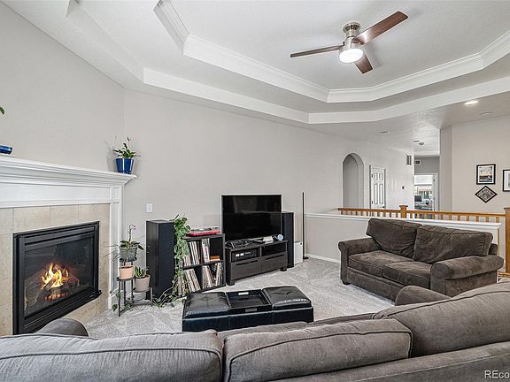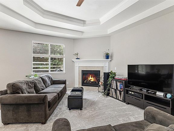 This exceptional ranch-style home offers incredible value with its spacious 4-bedrooms (all on main level), 3.5-bathroom layout featuring an open floor plan that seamlessly flows from a great room with coffered ceiling, crown molding, and gas fireplace. The elegant formal dining room has arched doorways and a butler's pantry. The chef's kitchen showcases slab granite countertops, a large island with breakfast bar, gas cooktop, beautiful cabinetry and a pantry plus breakfast nook that opens to a covered back patio perfect for summer entertaining. The finished basement provides additional living space with a generous recreation room and three-quarter bath with upgraded vanity and tile flooring. The bright primary suite boasts coffered ceilings, a sitting area, walk-in closet, and luxurious five-piece bathroom complete with soaking tub, tiled shower with seat, and tile floors. Three additional bedrooms include one with French doors ideal for a study or den, complemented by a main-level full bathroom, powder room, and convenient laundry/mudroom, plus unfinished basement space offering storage and expansion potential. Located in a desirable neighborhood within walking distance of the recreation center, pool, and trails, this home sits close to parks and open space while providing easy access to shopping, dining, golf, and I-25, with the added peace of mind that comes from newer roofing and newer carpeting throughout. This home is priced to sell so act fast.