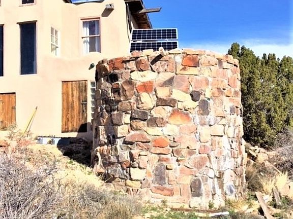 This property has views galore! The 3,000+- sf owner-built home is set in over 80 acres of pinon-juniper dotted land, close to a ridge of Morrison Formation sandstone. From the ridge (a great place for your morning coffee or happy hour), you can see the Jemez, Sandia, Ortiz, & Sangre de Cristo mountains. Trails from the house lead to the sellersâ special vistas. The house is off the grid & was built in three phases: first, frame & stucco; second straw bale; & third rastra block. Energy comes from about 20% wind/80% solar (owned); heat is propane & wood stoves & 2 fireplaces. There is a water catchment system; gray water is piped from sinks & tub to land. Internet is high speed radio signal. The 3 bedrooms & 1 bath (composting toilet) provide ample room, & the house is graced by unusual doors, bottle windows, bright tile work, & whimsical artistic touches. You really need to see this property. You wonât want to leave.