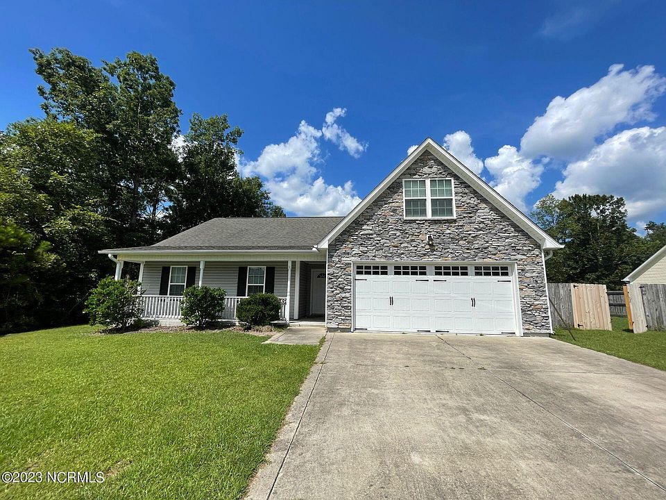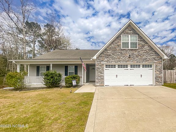 Welcome home to Blue Creek Farms! Beautiful one story four bedroom two bathroom home. This home is just minutes from MCAS New River and Camp Lejeune. Nice open living area with gas logs in the living room fireplace perfect for those chilly Carolina winters. Great kitchen with lots of cabinet space and open to the living area. You will find one bedroom located above the garage and the other three bedrooms located down the hallway. All are good sized with ample closet space. Then primary has a large ensuite with garden tub shower with double sinks. You will also find a large two car garage for all of your storage needs. This home is situated on a nice 1.89 acre wooded lot with a large custom deck and brick paver patio in the backyard.