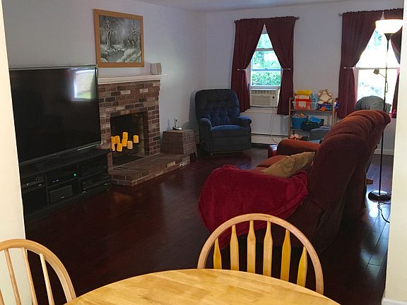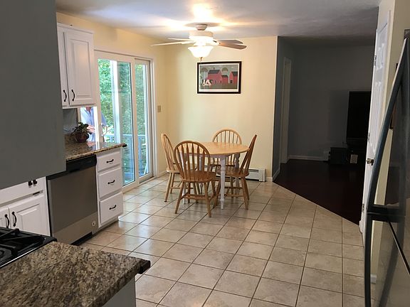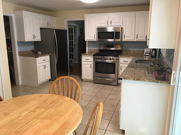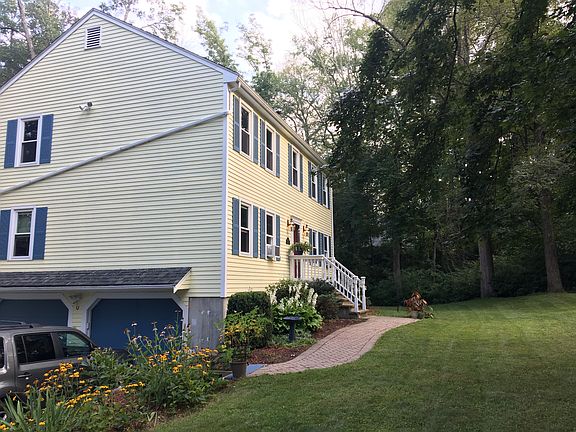 Colonial w/ 4 bedrooms and 2.5 baths, gas heat, 2 car garage under and a large private yard. Good size eat-in kitchen with granite counter tops, new stainless steel appliances, gas cooking, and a slider to the deck. Formal living room with french doors. Formal dining room or office. Family room with fireplace. First floor bathroom with laundry. The second floor features four bedrooms with new wood floors and two full baths including master bath. Large yard is surrounded by trees, has a stream, a bridge and a garden. Recent updates include - roof with seamless gutters and gutter guards, furnace, windows, appliances, wood floors, light/fan in master bedroom, granite counter tops in bathrooms, water saving toilets, shed, and landscaping with many perennials. Great commuter location, near shopping and commuter rail.