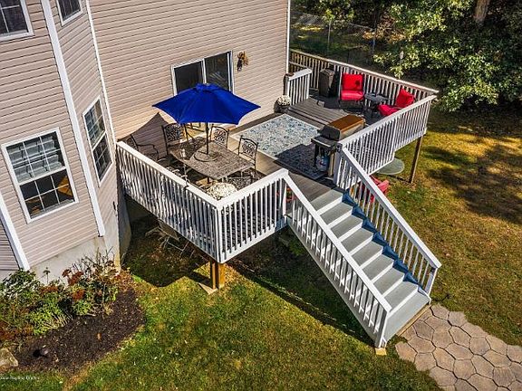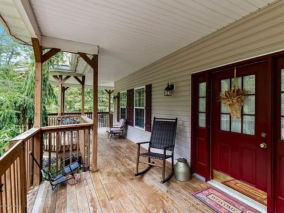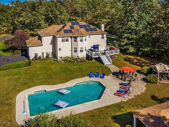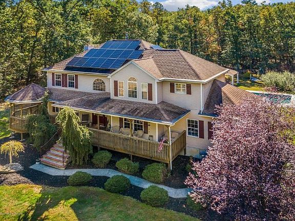 You Don't Want to Miss This Unique Home Packed With Special Features. Entertain family and friends in a private oasis on 4.44 acres with a heated, inground beautifully durable gunite pool surrounded by a stamped concrete patio. Relax in the outdoor pavilion with electricity and a large granite bar with seating. Or choose to relax at the fire pit or under the gazebo. A 400 ft driveway provides plenty of parking and privacy. Step onto the wrap around porch with plenty of seating areas, then enter the home into a 2-story open foyer. Head to the eat-in kitchen with 42'' oak cabinets, a breakfast bar and granite counters and backsplash. The family room has a gas fireplace with sliding doors which lead to an oversized deck and another side door exit that leads to a dog run