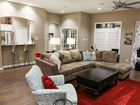 3 bedroom/2 bath plus office/playroom on extra deep lot with custom built-in desk and storage. Granite throughout. Stainless steel appliances, large kitchen island. Large, open living room with built in media storage. Built in speaker system and custom network wiring. Wood and tile flooring throughout with carpeted bedrooms and office. Remote master suite includes extra-large master closet with island. Master closet opens to laundry. Sprinkler system in back yard. Mosquito Mist system. HOA covers water, sewer, trash, front yard mowing, repaints house every 5 years, front yard flowerbeds and sprinkler system, vinyl siding on exterior of home, fence and mailbox maintenance, 24 hour guard service, private boat launch to Red River, and stocked fishing ponds around the neighborhood.