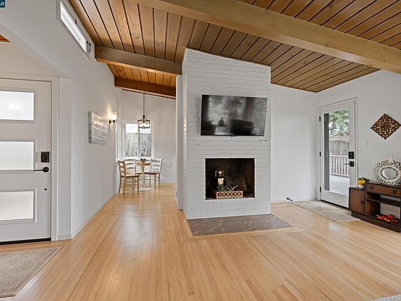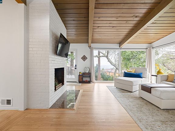 $1,250,000 transparency pricing-Sellers bought for $1,300,000 & have since replaced roof, doors, most windows, upgraded lighting & kitchen appliances! What a great opportunity! This charming mid-century modern home is 1,152 sq ft & offers contemporary comforts set in the idyllic nature of the coveted Berkeley Hills. 2 bedroom (plus bonus room) home boasts full bathroom w/ laundry, chic living & dining room overlooking the Bay, updated eat-in kitchen, beautiful back patio area w/ AMAZING Bay views & backyard pathways offering multiple entertaining areas. As you walk through the lush & green enclosed front patio into the home, you will be delighted by the exposed wood vaulted ceilings & grand windows allowing natural light to fill the living & dining room. A wall of windows overlooks the Bay, boasting stunning views year-round. The decorative brick fireplace adds modern elements to the space. The well-planned kitchen comes w/ gorgeous quartz counter tops, stainless steel appliances, gas range & plenty of cabinet & storage space. All three bedroom are inviting and roomy w/ a lot of closet space & impressive windows filling the rooms w/ natural light. The full bathroom comes complete with generous counter tops, updated vanity, shower over tub & all-in-one washer & ventless dryer.