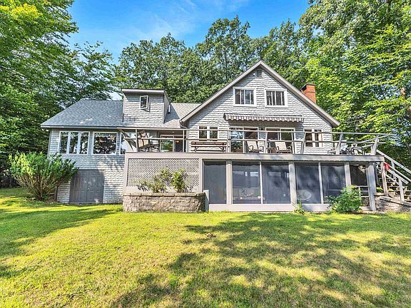 Tranquility awaits! This superior year round waterfront compound on beautiful Thorndike Pond includes custom residence, three car detached garage outbuilding with equipment area and outstanding large modern outbuilding barn with expansion potential for additional guest quarters. Set well back from a quiet road on a privacy ensuring 1.7 acre +/- lot abutting conserved land, is this much loved home...available for the first time in over 40 years! The residence is tastefully updated and designed to offer unobstructed views of the water throughout. Beautifully landscaped grounds and open play lawn lead to three established dock areas and natural sandy beach, set across from a conserved island with no other properties in sight. The interior features a large kitchen wing with cathedral ceiling added in late eighties and recently updated for the best in modern convenience, fireplaced living room, first floor bedroom with double vanity spa bath, two large additional bedrooms vaulted ceiling loft area upstairs with full bath. A walkout lower level includes finished family room, screened porch, additional bath and offers great potential for expansion. Offered fully furnished and equipped with watercraft. A rare find indeed...on one of southern New Hampshire's finest clear water bodies!